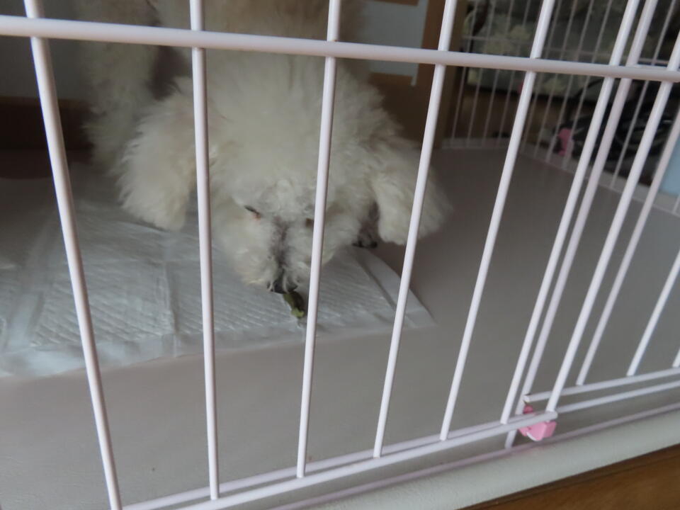午後のおやつ。ココちゃんはサークルで。