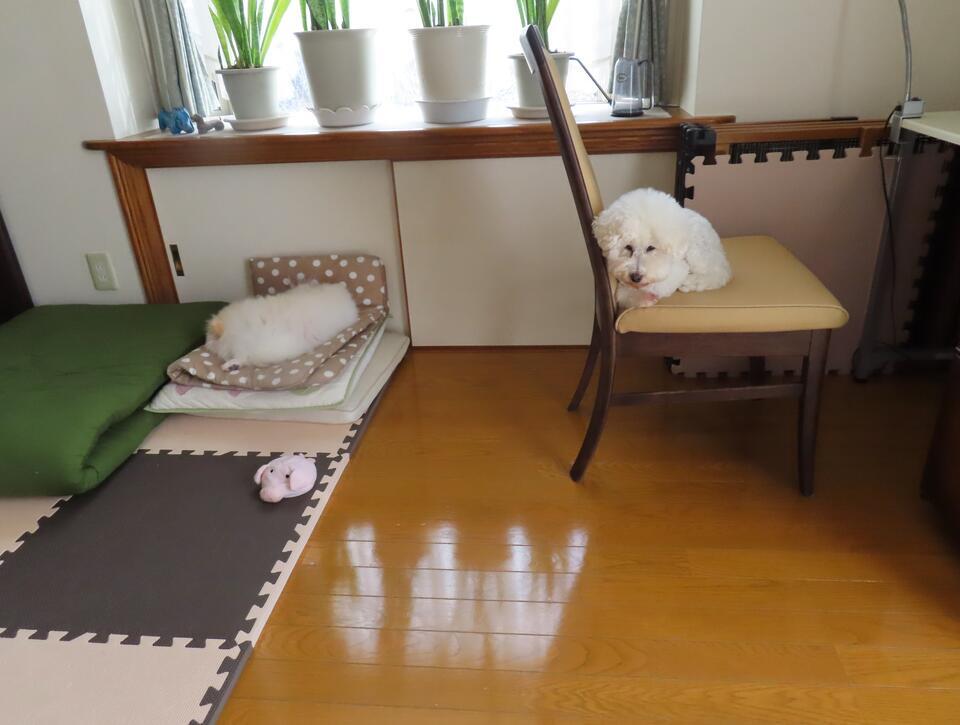 シュガーちゃんとモコ。それぞれ好きな場所でお昼寝タイム。